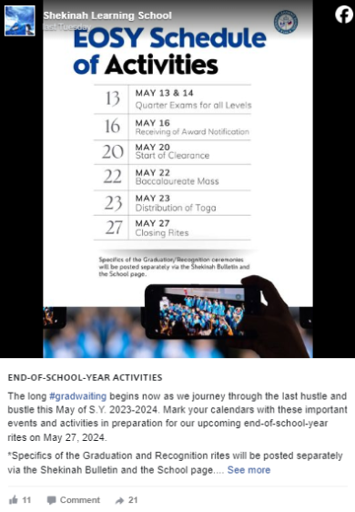 Shekinah Learning School is dedicated in enhancing the students’ spiritual and moral values as foundations for their optimum personality development. The School fosters joyful learning experiences through academic subjects that develop Individual’s skills, talents and values that are most helpful for his/her journey through life.